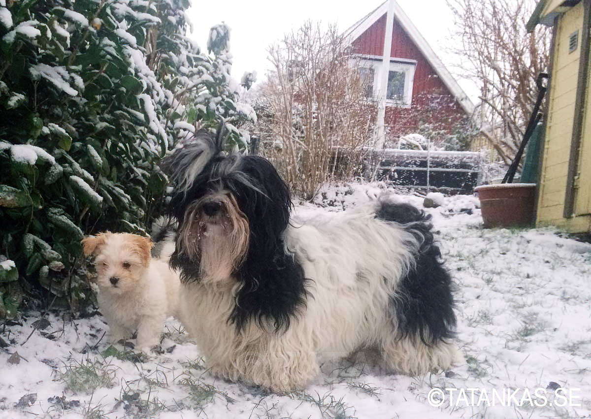 G-kullen valpar Bichon Havanais leker på trappen i snön