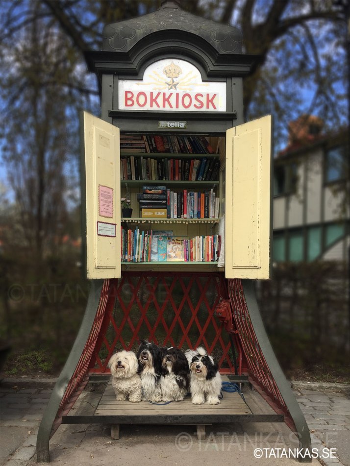 Telefonkiosken i Sigtuna bjuder på låneböcker, bara att hämta och kanske lämna in någon annan bok i utbyte. Våra hundar älskar att hänga i det lilla biblioteket, visdomen liksom regnar ner över dem.